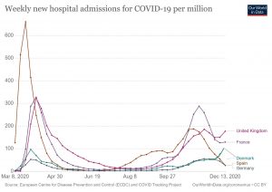 Det er der noget om, selv om det ikke er nogen undskyldning for en fejl, at andre også har fejlet. Her er en graf, jeg har fremstillet på data-samlesitet Our World In Data; jeg har valgt tal for Danmark samt fire store europæiske lande. Af en eller anden grund mangler sitet data for Danmark for de sidste tre uger; jeg har derfor forlænget den danske kurve med de faktiske tal.